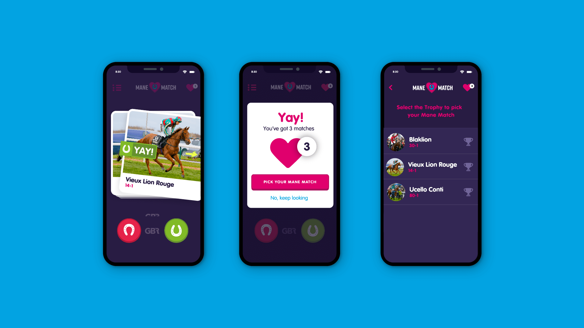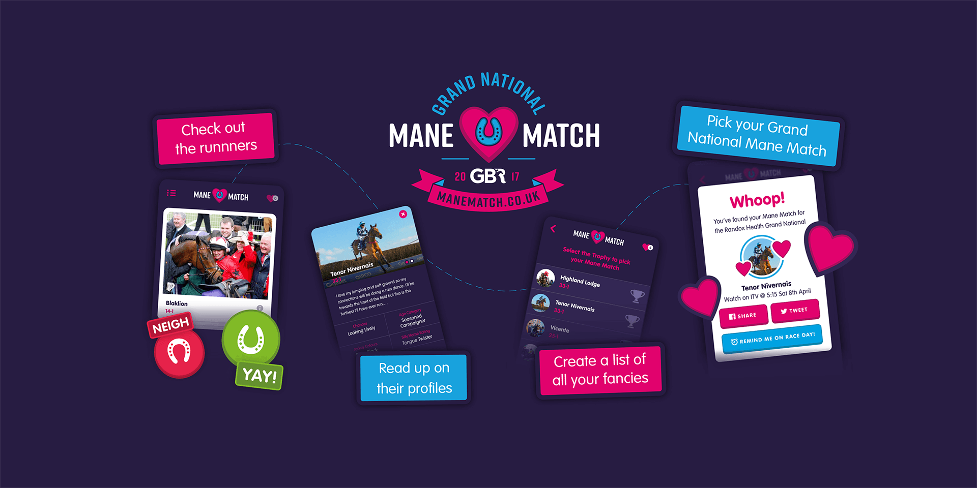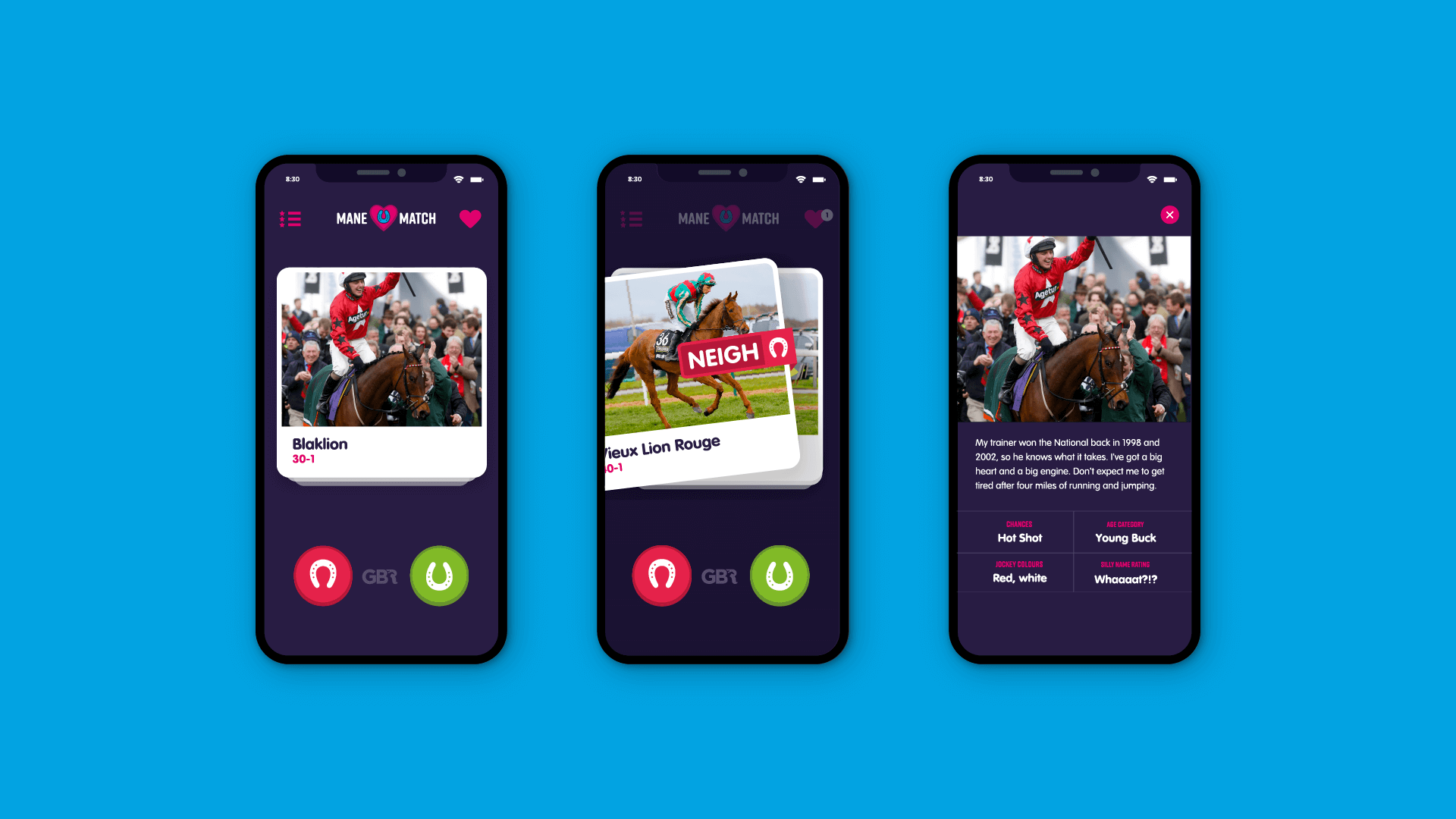 Great British Racing (GBR) came to us with an idea to generate excitement in the lead up to the Grand National at Aintree. The idea was a Tinder-style app for race horses, giving punters a fun way to find their pick. They needed help to bring the idea ‘Mane Match’ to reality. So we did just that. We designed a logo and visual look, defined the user experience and interface design across the app, then developed and launched it. With just a few swipes left and right, you can find your perfect match for the Grand National.